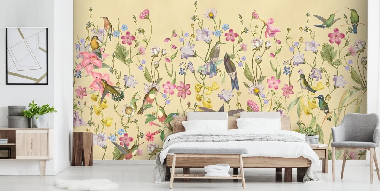 Questa splendida carta da parati colibrì chiamata Spring Garden with Birds è un design di Marina Stupakova. È la carta da parati cineserie perfetta per una bella camera da letto, soggiorno e altro ancora. Scegli un colore dal design, come il rosa, e usalo come ispirazione per il resto della stanza. Un divano rosa, tende rosa, un tappeto rosa ecc.