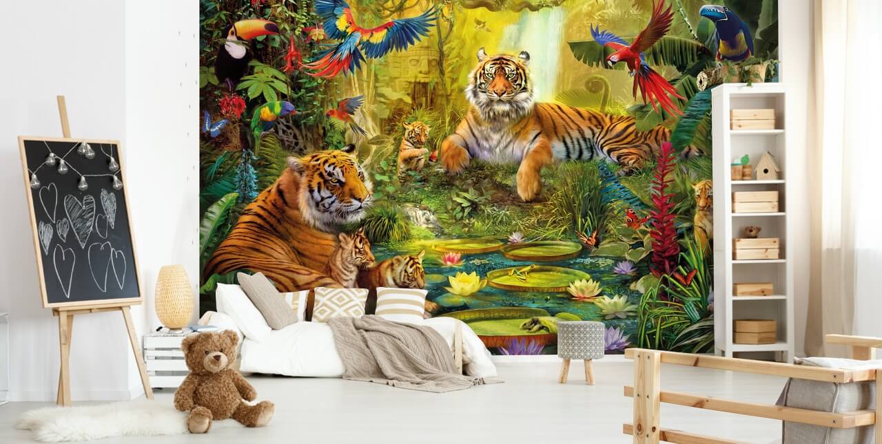 Ti piacciono le tigri? Adorerai questa carta da parati Tiger Family in the Jungle. Che bella gamma di colori e dettagli... È il murale perfetto per il safari nella giungla!