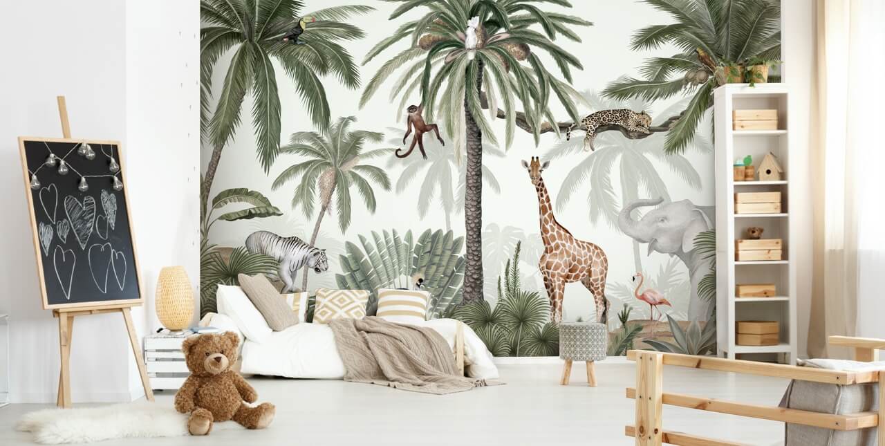 Vuoi migliorare il tuo gioco nella cameretta dei bambini? Allora scegli questo murale di carta da parati Tropical Jive su misura di Wallsauce. Abbina questa simpatica carta da parati con animali a un mix di accessori e decorazioni per la camera di colore verde salvia, grigio chiaro e marrone nocciola.