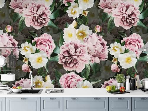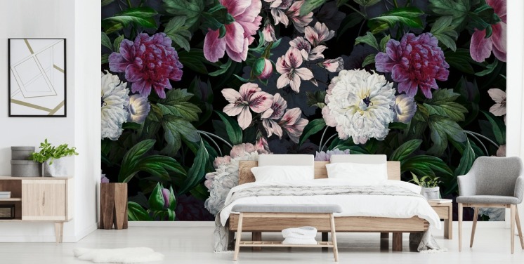 carta da parati peonie nere, verdi e rosa