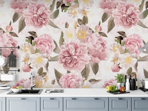 carta da parati peonie rosa e fiori gialli e bianchi