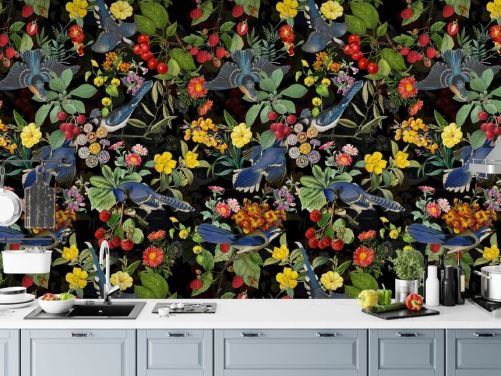 carta da parati uccelli blu e fiori rossi e gialli