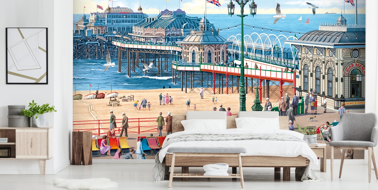 Porta la magia del molo di Brighton nella tua casa di cura con Vintage Brighton, una carismatica carta da parati per case di cura dell'artista Victor McLindon.