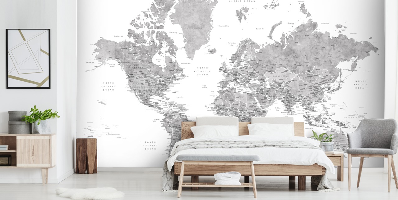 Dai un'atmosfera elegante ed educativa alla tua casa o al tuo spazio di lavoro con questo murale con mappa del mondo con città in grigio.