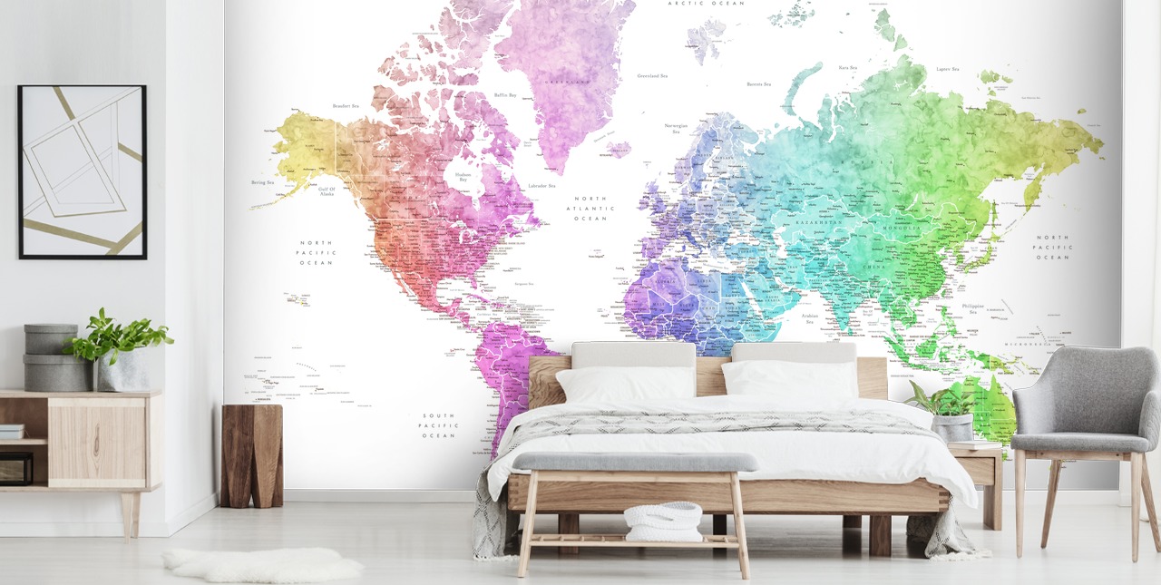 Aggiungi un tocco di vivacità a qualsiasi stanza con il nostro murale con mappa del mondo nei colori dell'arcobaleno di Rosana.