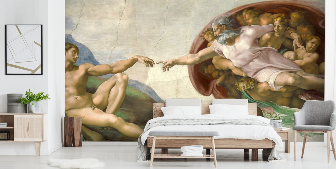 Crea uno spettacolare punto focale in ogni stanza con la carta da parati murale La Creazione di Adamo di Michelangelo.