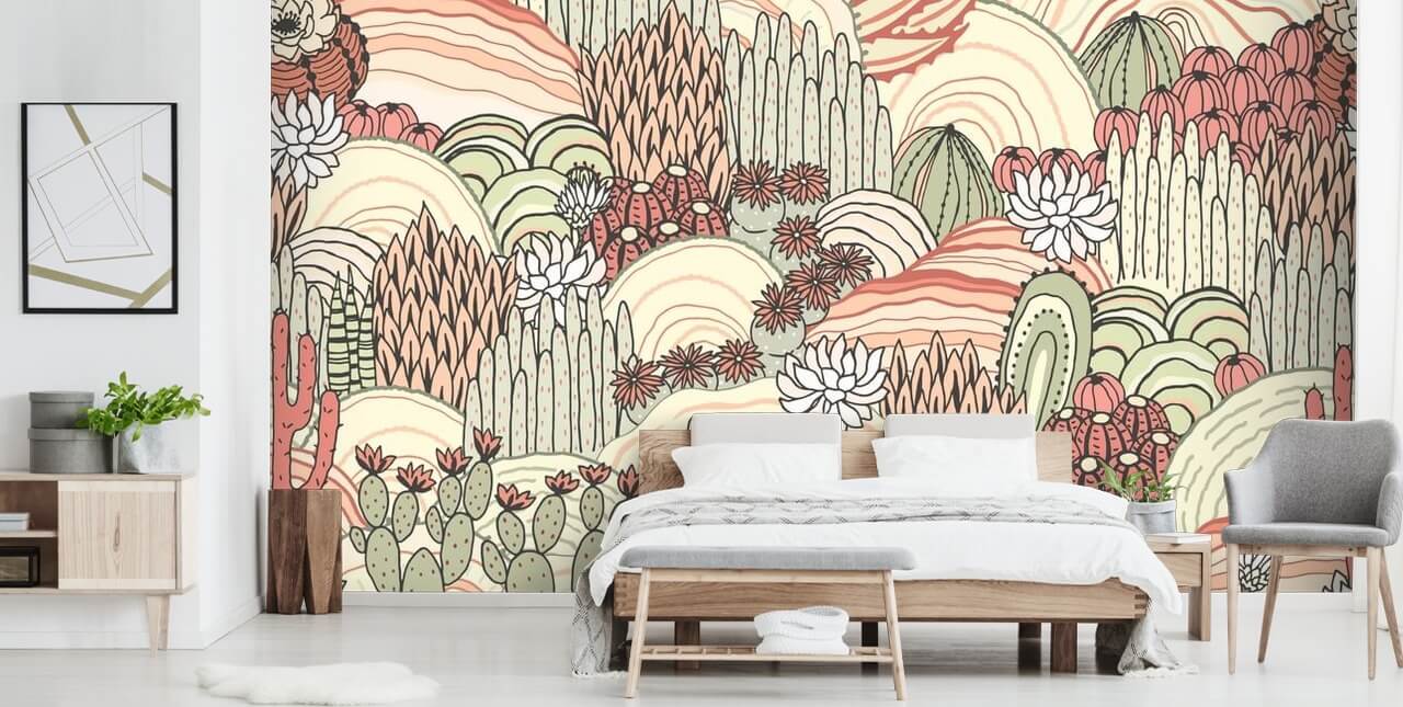 Donate uno stile retrò alle vostre pareti con questa carta da parati su misura anni '60 Cacti Landscape.