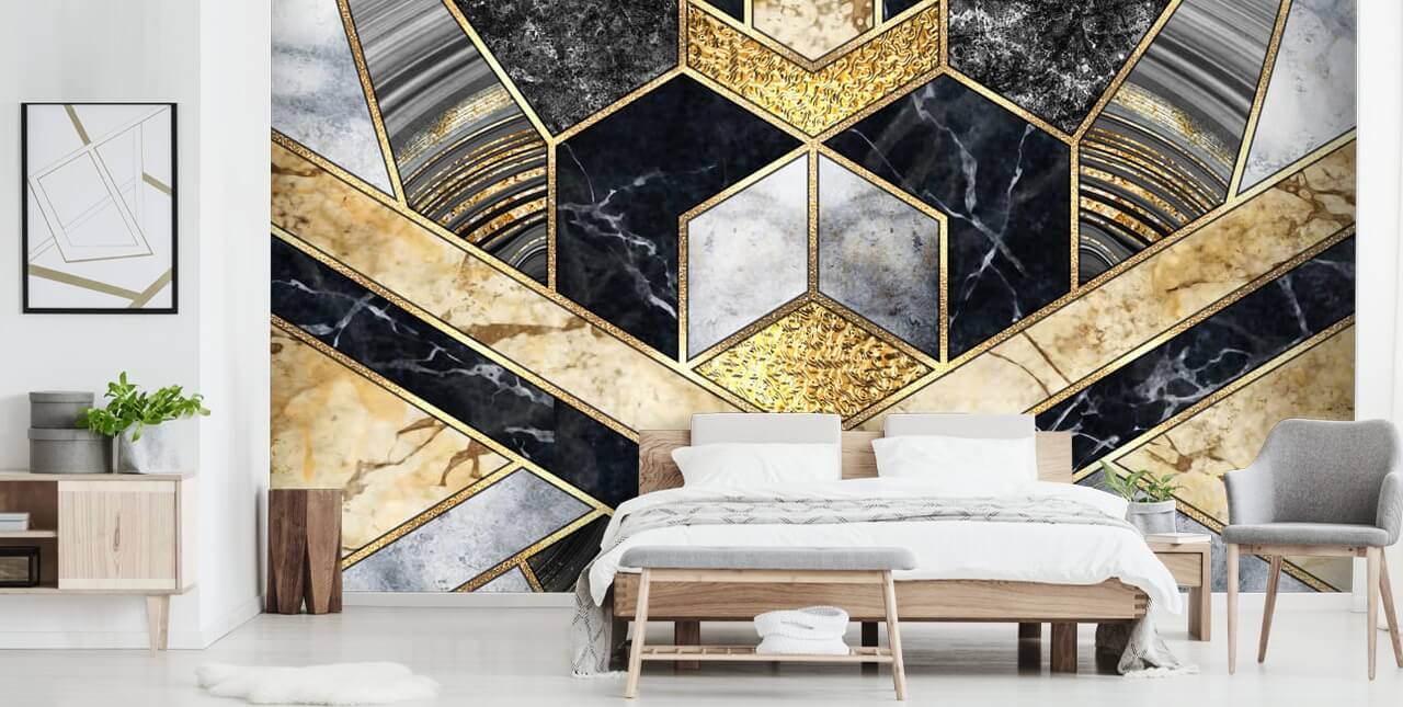 Se stai puntando al glamour assoluto degli anni '20, scegli questa carta da parati Artistic Symmetry in oro e marmo. Non amate il mix di marmi di diverse tonalità, oro e affascinanti motivi geometrici?