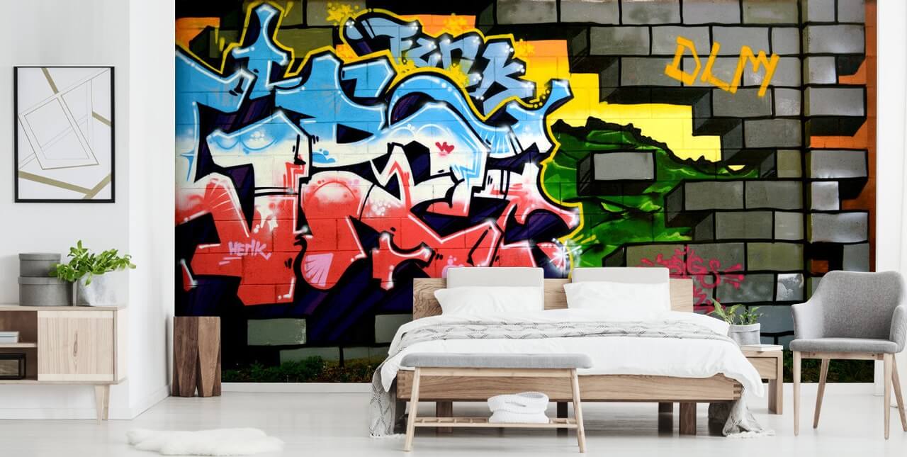 Una nuova interpretazione della moderna tendenza della carta da parati in mattoni, questa carta da parati con graffiti è perfetta per aggiungere carattere a qualsiasi stanza. Infiltrarsi nel muro di mattoni è una scena di street art di graffiti che utilizza colori vivaci e street tag.