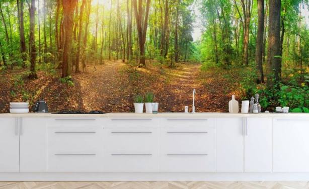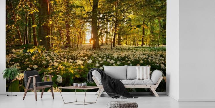 carta da parati murale verde personalizzabile chiamata Beautiful Sunlit Forest per camere da letto e salotti