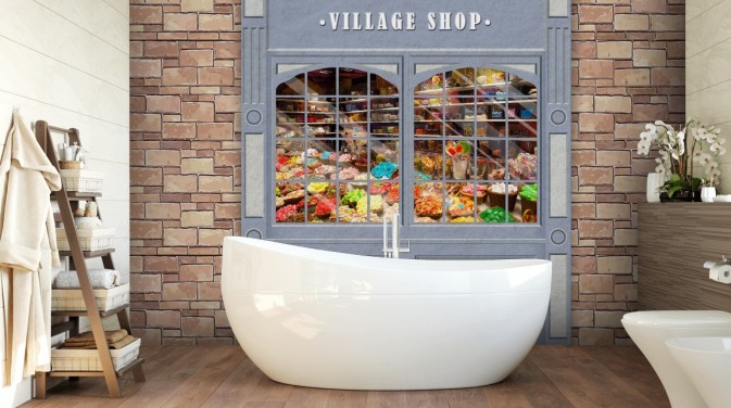 carta da parati murale personalizzata per facciate chiamata Village Shop per case di cura