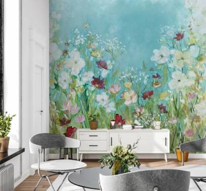 carta da parati murale colorata personalizzata con fiori chiamata Wildflowers and Lace di Carol Robinson per salotti