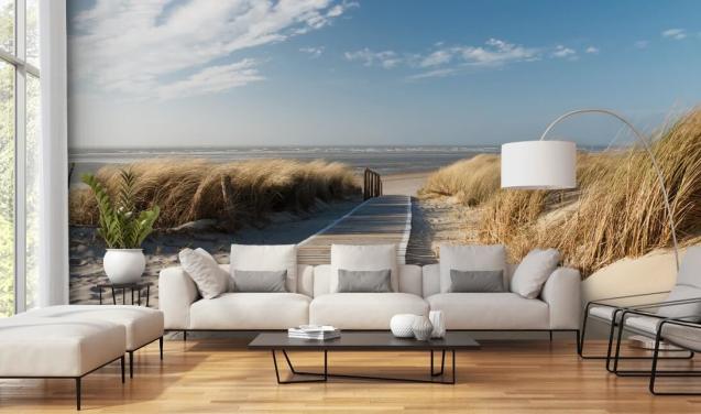 carta da parati murale da spiaggia personalizzabile blu e oro chiamata Windswept Beach Boardwalk per sale da pranzo o cucine