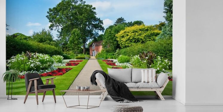carta da parati murale verde personalizzata con paesaggio da giardino chiamato English Country Garden per case di cura e uffici