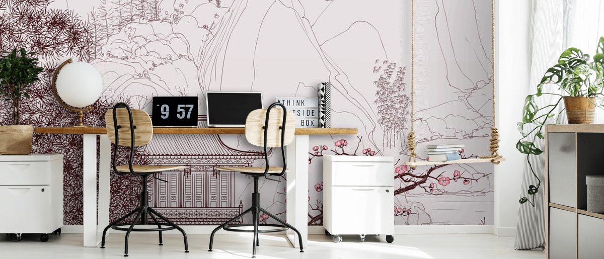 Lasciati trasportare in terre lontane con questa splendida carta da parati Delicate Chinese Landscape. Adoriamo le linee sottili in questa illustrazione dalle montagne rocciose, dalla casa orientale decorata e dal ramo di fiori di ciliegio ad arco.