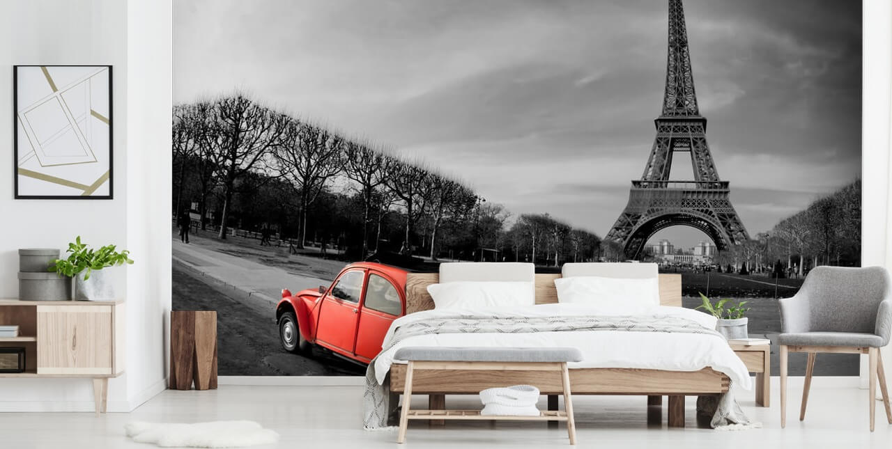 Splendida carta da parati Torre Eiffel e Old Red Citroen. Realizzato su misura per adattarsi a qualsiasi parete.