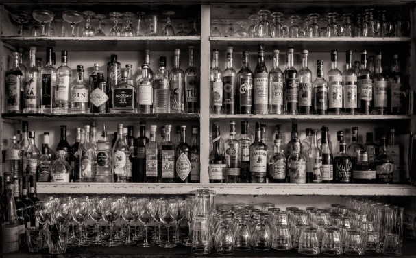 bottiglie bianche e nere sullo scaffale dietro una carta da parati da bar