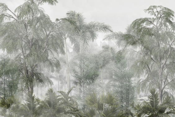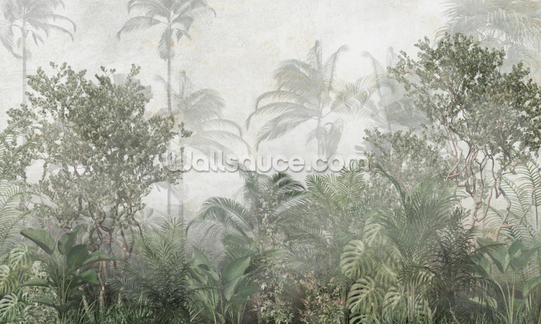 Alti alberi tropicali verdi della giungla in una giungla con una morbida carta da parati color foschia