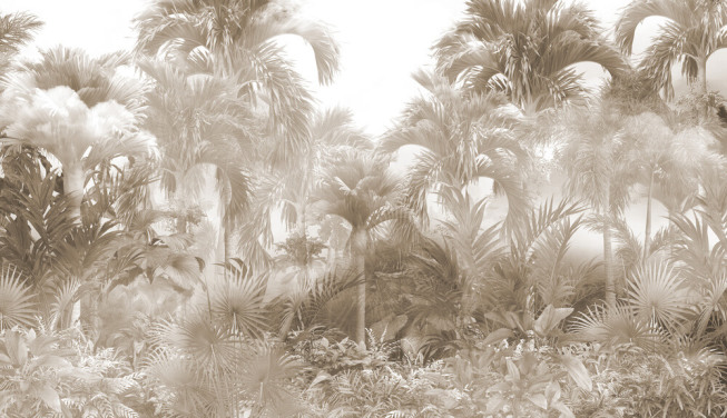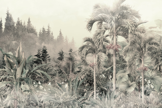 carta da parati murale vintage verde personalizzata con foglie di palma chiamata Tropical Landscape 2 di Andrea Haase per camere da letto