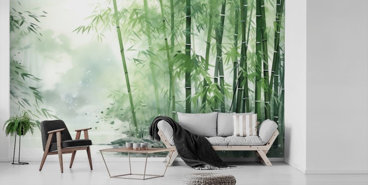 carta da parati murale verde personalizzata con foresta chiamata Zen Waterfall per salotti