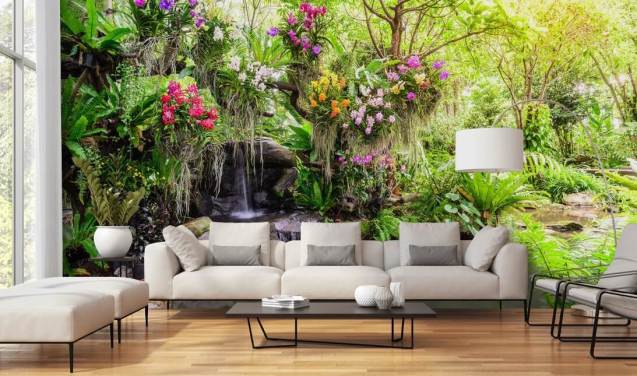 carta da parati murale verde personalizzata a cascata chiamata Orchid Garden Waterfall per salotti