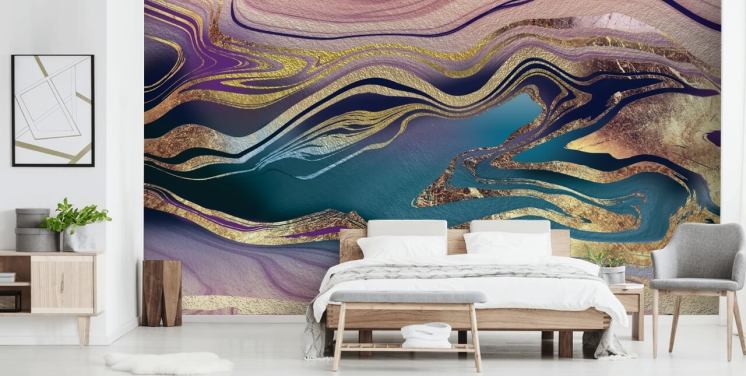 carta da parati murale in marmo verde, viola e oro chiamata Marble Floral New Master di Lara Skinner per camere da letto o bagni
