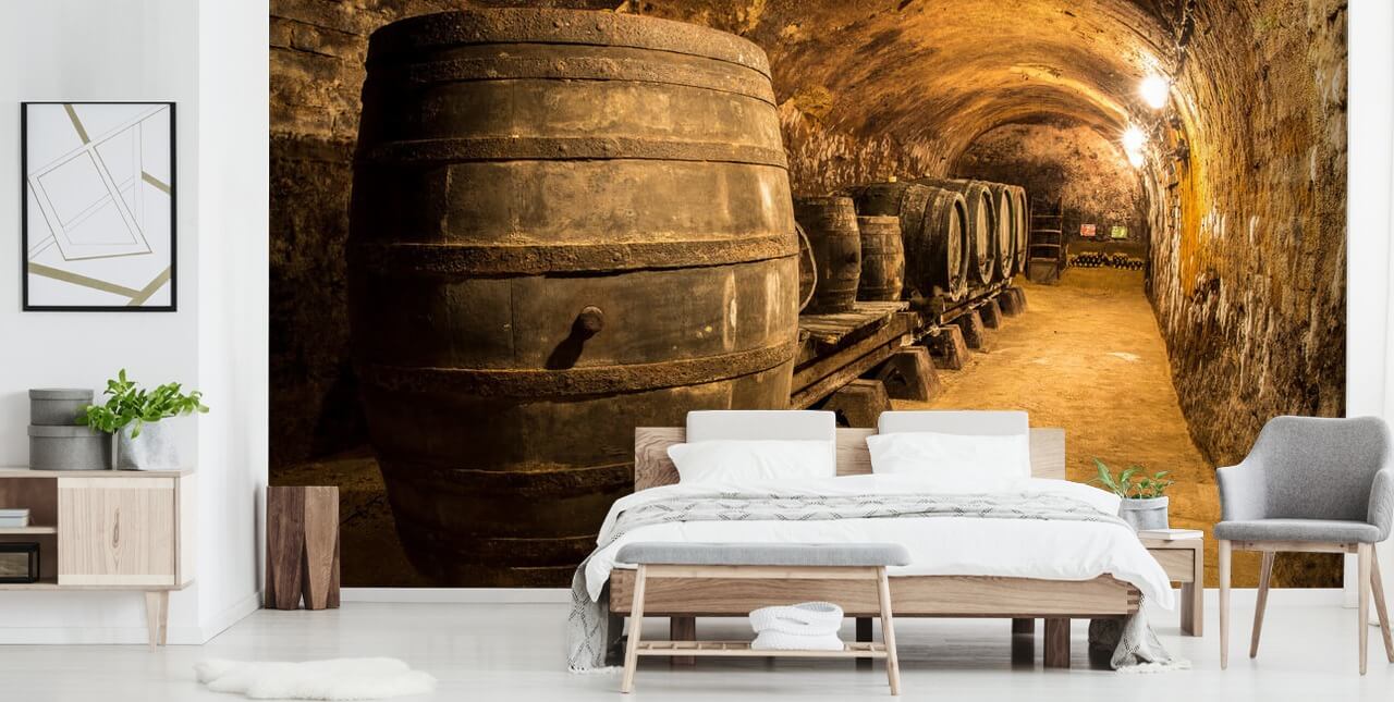 Carta da parati con vecchie botti di legno nella cantina. Progetta la tua cucina intorno alla tua bevanda preferita e crea un luogo suggestivo.