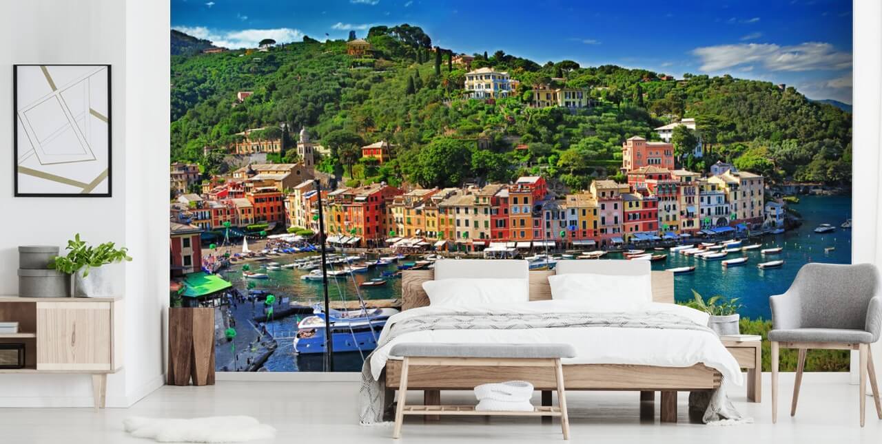 Sentiti come se avessi viaggiato in lungo e in largo e atterrato nella bellissima Italia con questo murale di carta da parati su misura Portofino sulla tua parete. Che bella carta da parati italiana per una casa colorata!