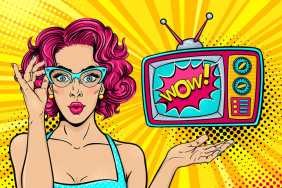 donna retrò dai capelli rosa che indossa gli occhiali con la tv che dice wow sullo schermo murale