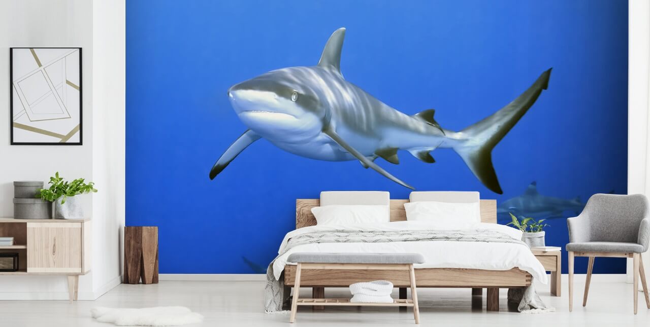 Se usato nella camera da letto di un bambino, posiziona questa simpatica carta da parati con squalo sulla parete accanto al loro letto in modo che possano guardare il loro amico squalo quando viene portato a letto! Dipingi le pareti in una tonalità di grigio chiaro e indossa un tappeto blu! Abbina graziose lenzuola e tende a forma di squalo!