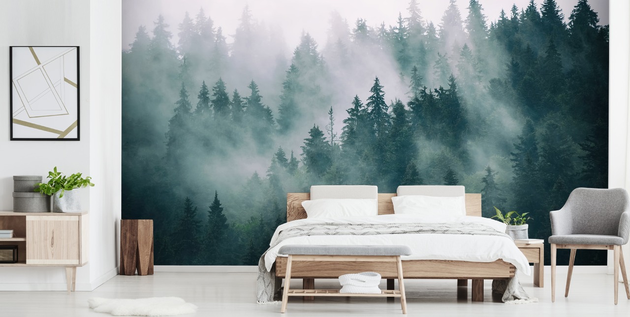 Sentiti calmo e tranquillo con questo murale su misura Smokey Misted Forest.
