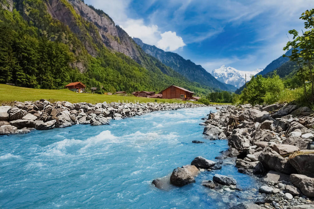 Installate questo murale di carta da parati su misura Swiss Landscape. Disponibile in carta da parati da parete peel and stick o paste.