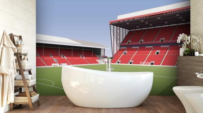 carta da parati murale con stadio di calcio rosso e verde chiamato Anfield Football Stadium di Matthew J I Wood Design & Illustration per la camera da letto del bambino
