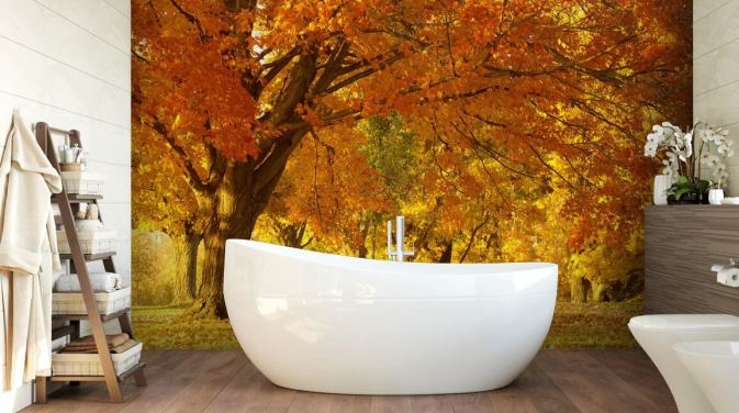 carta da parati murale con boschi gialli e arancioni chiamata Autumn Forest with Yellow Leaves per salotti, uffici domestici e camere da letto