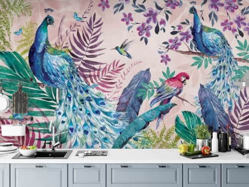 carta da parati murale con pavone tropicale viola e blu chiamato Tropical Peacock di Di Brookes per camere da letto e salotti