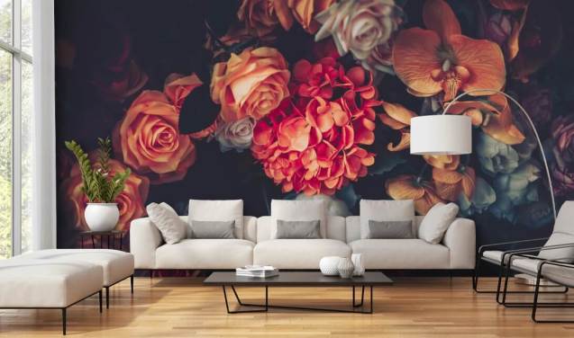 carta da parati scura con rose rosse e fiori arancioni