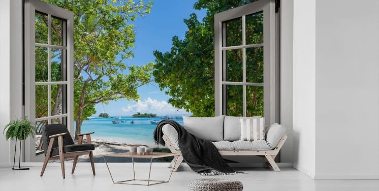 murale bianco e blu con finestra sulla spiaggia esotica chiamato Paradise Bay View per case e aziende