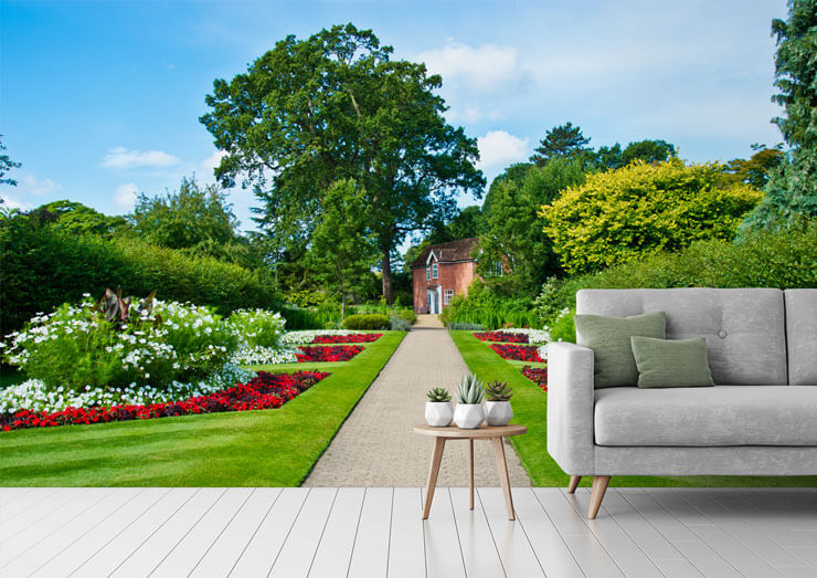 For the keen gardener, a serene garden mural will remind them of summer every day of the year! Add this passion to the internal walls in any room of the home with a made-to-measure garden mural from our landscape range. Living rooms and dining rooms are a fond favourite to install a stunning garden mural. Don’t you just love this serene English Country Garden wallpaper in this lounge? The clever installation of the garden wallpaper in this sociable area will be a fantastic talking point when hosting for family and friends.