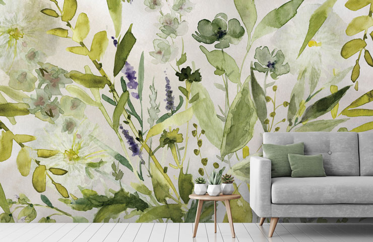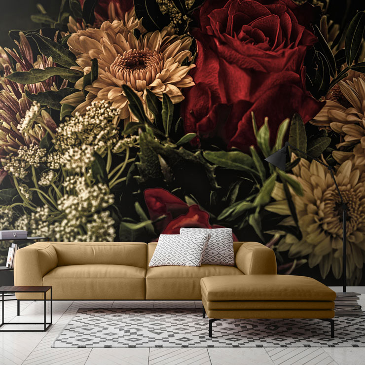 Dit bloemenbehang is een opvallend voorbeeld van hoe je de natuur in je woonkamer kunt integreren.