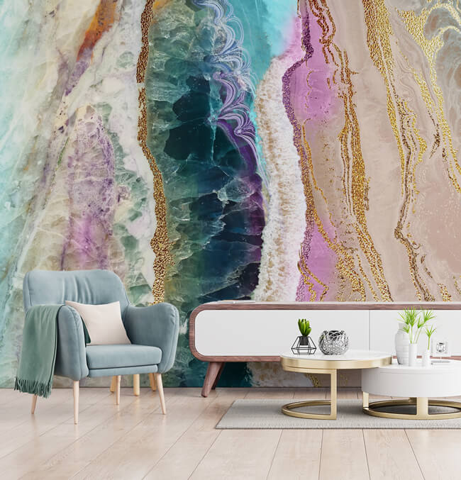 Om die koude, strenge en klinische look te vermijden, kies je voor een gebroken witte tint in plaats van puur wit. Er zijn maar weinig binnenhuisarchitecten die met puur witte verf werken. Kies in plaats daarvan voor warmere tinten of wit met een vleugje kleur erin. Om onaantrekkelijke leegtes of kale stukken muur op te breken, voeg je textuur en intrige toe met behang met een patroon. Muurschilderingen met marmereffect kunnen bijvoorbeeld een mooie accentmuur vormen, die een mooi centraal punt toevoegt in een minimalistische omgeving.