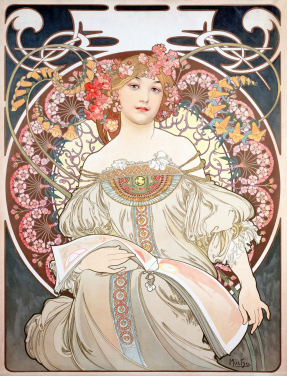 Art nouveau behangmuurschildering genaamd Job (1896) van Alphonse Mucha voor woon- en slaapkamers