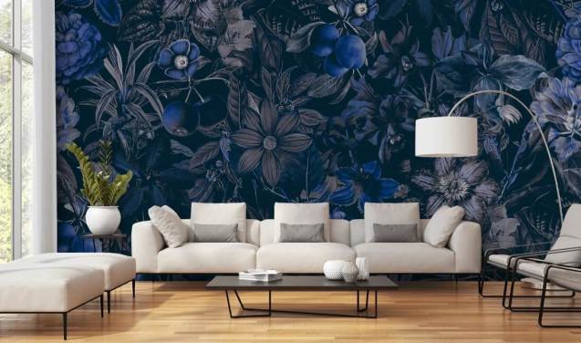donkerblauw bloemenbehang