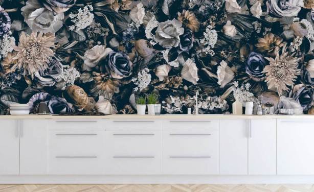 donkere bloemenmuurschildering genaamd Vintage Flower Meadow van Andrea Haase voor slaapkamers, woonkamers en eetkamers
