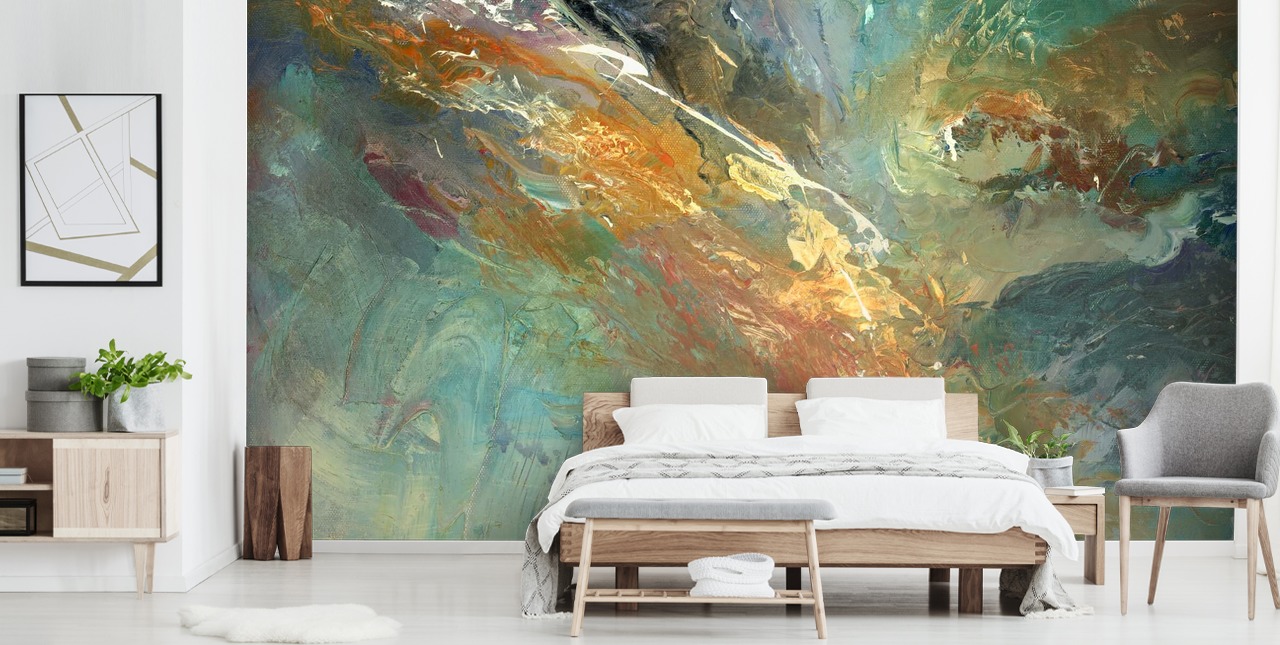 Kleurrijk en abstract, de prachtige Intangable behangmuurschildering van Anne Farrall Doyle is iets dat we allemaal zouden kunnen waarderen in ons huis of op het werk.