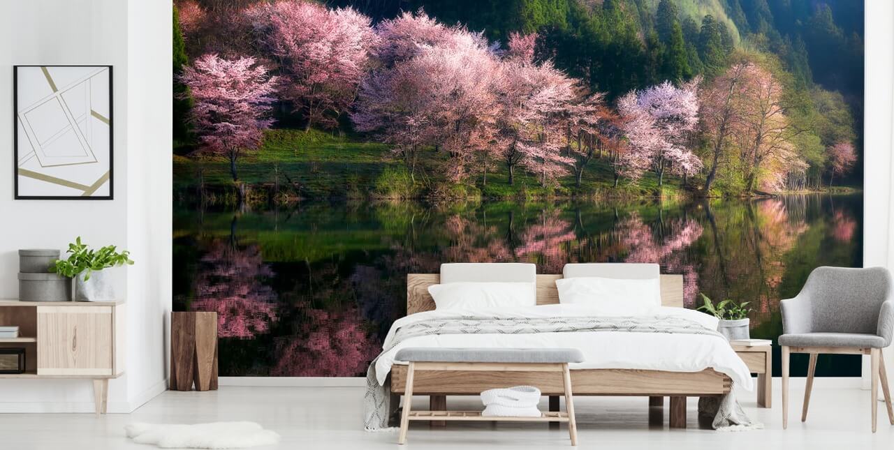 Waarom installeer je dit bloesembehang niet in je woonkamer? U kunt de omringende muren in een witte tint schilderen en een reeks groene en paarsroze tinten hebben in uw keuze van kameraccessoires.