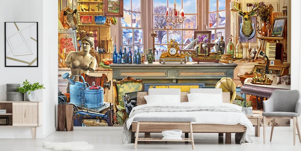 Installeer deze op maat gemaakte Antique Shop muurschildering.