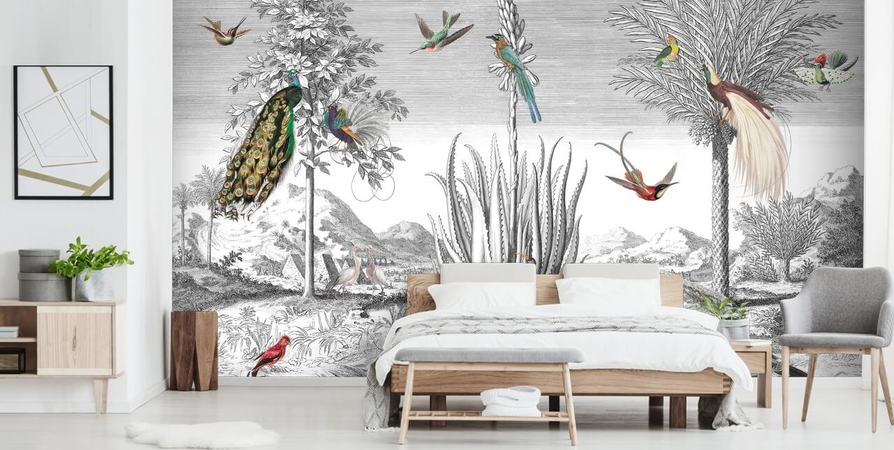 Dit prachtige vogelbehang is zo ontworpen dat de kleurrijke en monochrome tinten synchroon werken. De kleurrijke vogels springen echt uit de zwart-witte achtergrond en creëren bijna een 3D-illusie...