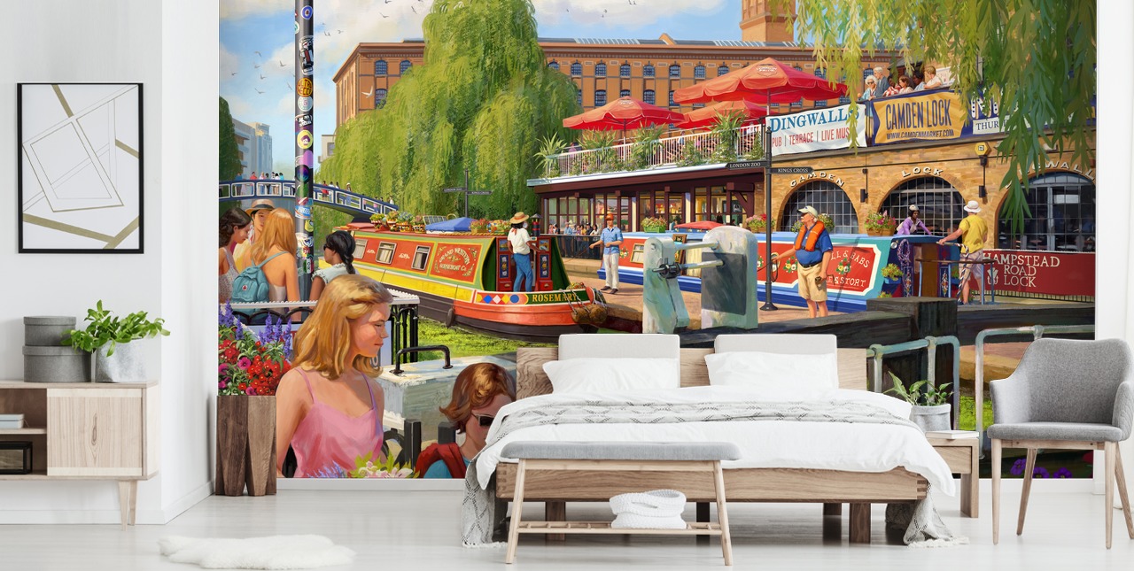 Breng een drukke Londense scene tot leven op elke eenvoudige muur met de Camden Lock muurschildering van Daniel Rodgers.