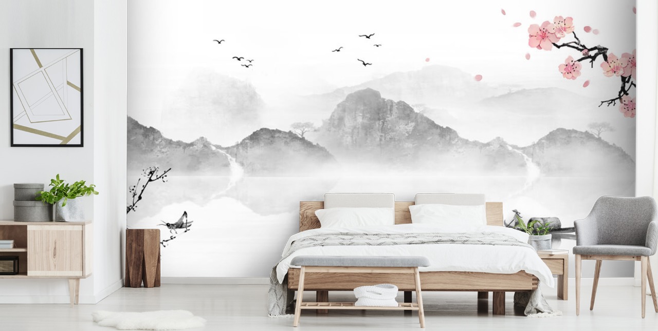 Transformeer elke kamer met deze delicate muurschildering met Chinese inktlandschap. Onze oosterse muurschilderingen zijn op maat gemaakt en eenvoudig te installeren.
