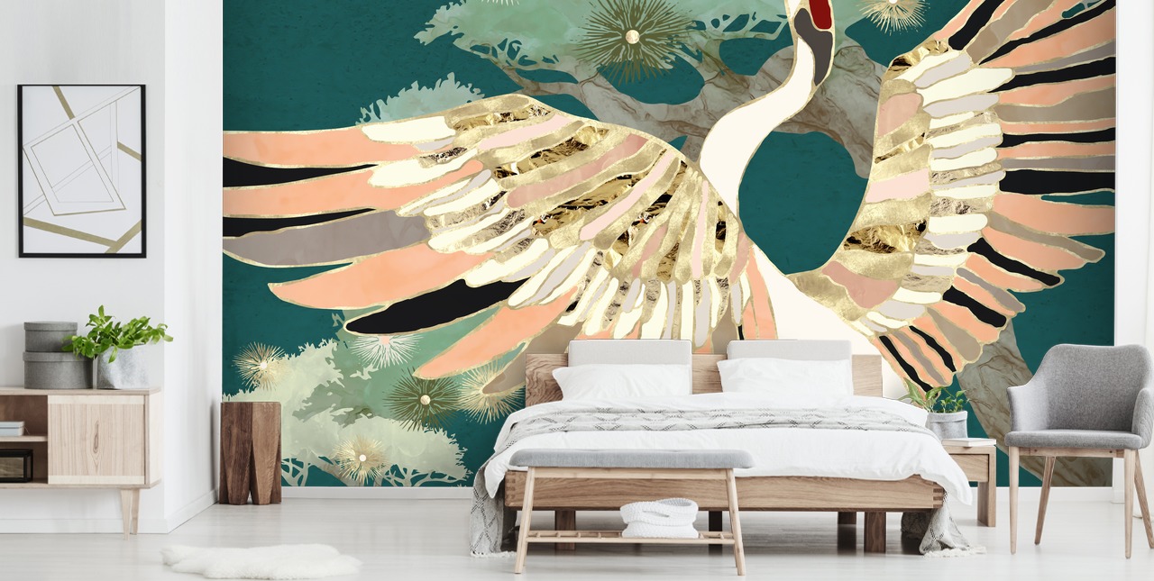 Met prachtige tinten groenblauw, roze, wit en goud is dit prachtige Dancing Crane behang de ultieme feature wall voor een glamoureuze look!